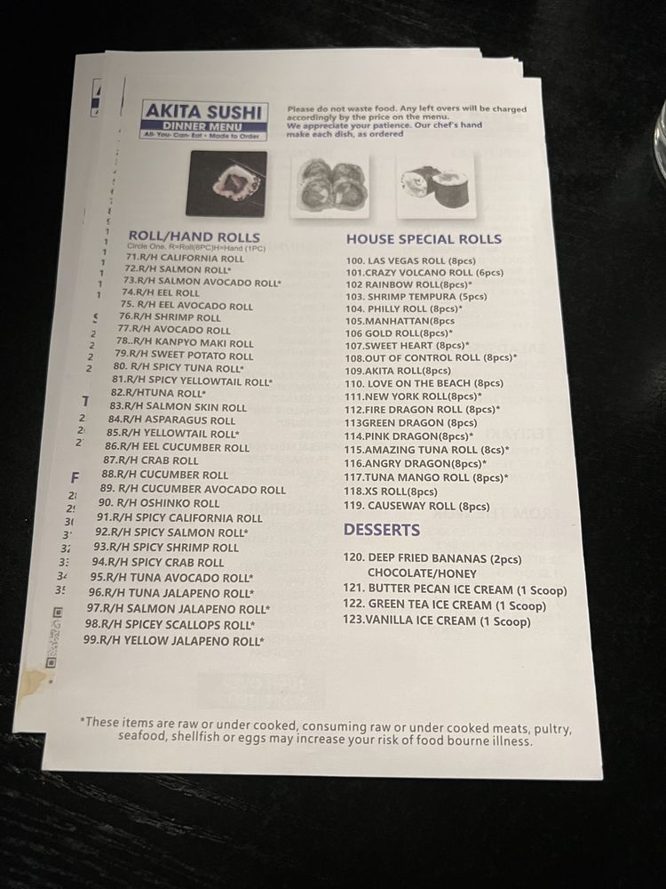 Introducing Akita Sushi, a vibrant sushi bar located in Scottsdale, AZ. This casual spot offers a variety of vegan options, delivery services, and wheelchair accessibility. Customers rave about the attentive service and fresh, delicious sushi. The menu includes crowd favorites like the salmon roll and out of control roll, along with unique options like the Akita roll with marinated lobster meat. Not just limited to sushi, Akita also serves up tasty yakitori, udon soup, and matcha ice cream. The atmosphere is stylish and fun, making it perfect for group gatherings or family outings. With reasonable prices and quality ingredients, Akita Sushi is a must-visit for sushi lovers in the area.