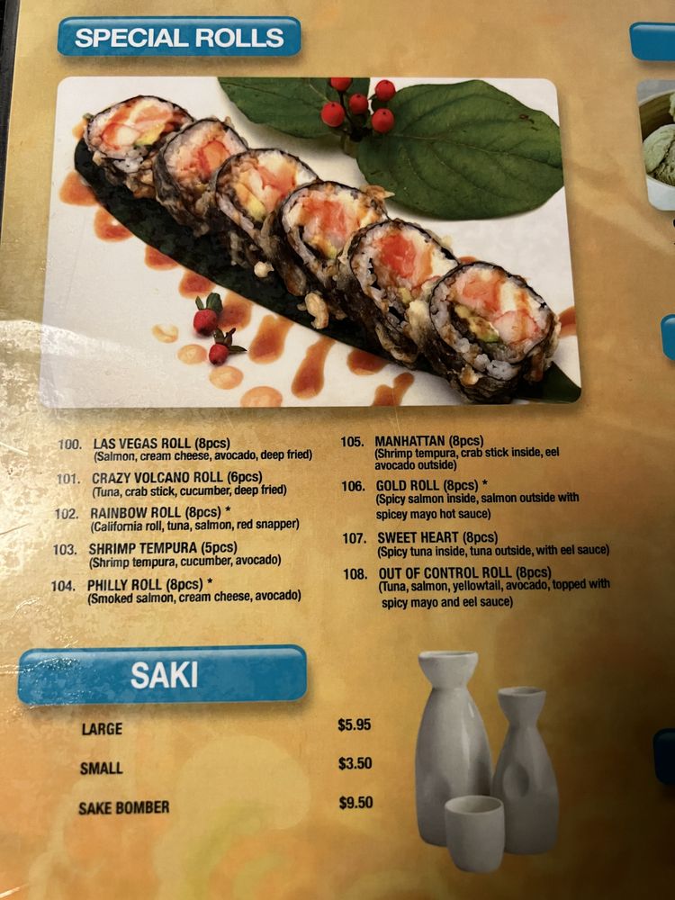 Shrimp tempura, cream cheese, crab stick, avocado, mango, topped with eel sauce, spicy mayonnaise, and honey wasabi sauce. Rolls cut into to pcs.